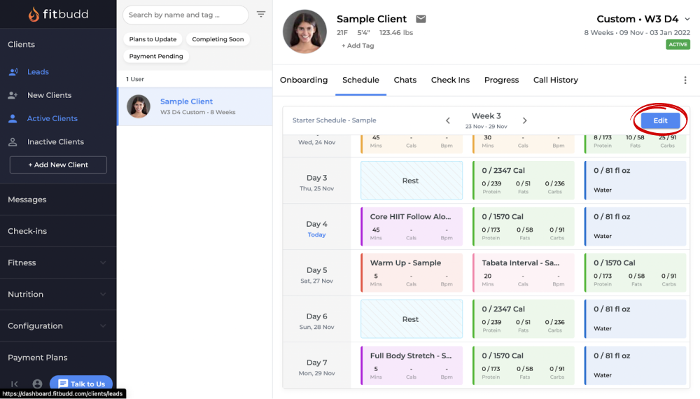 1. Go to the ‘Clients’ section, move to the ‘Active Clients’ section and open the profile of the client you want to assign the Meal Schedule to. Click on the ‘Schedule’ tab.