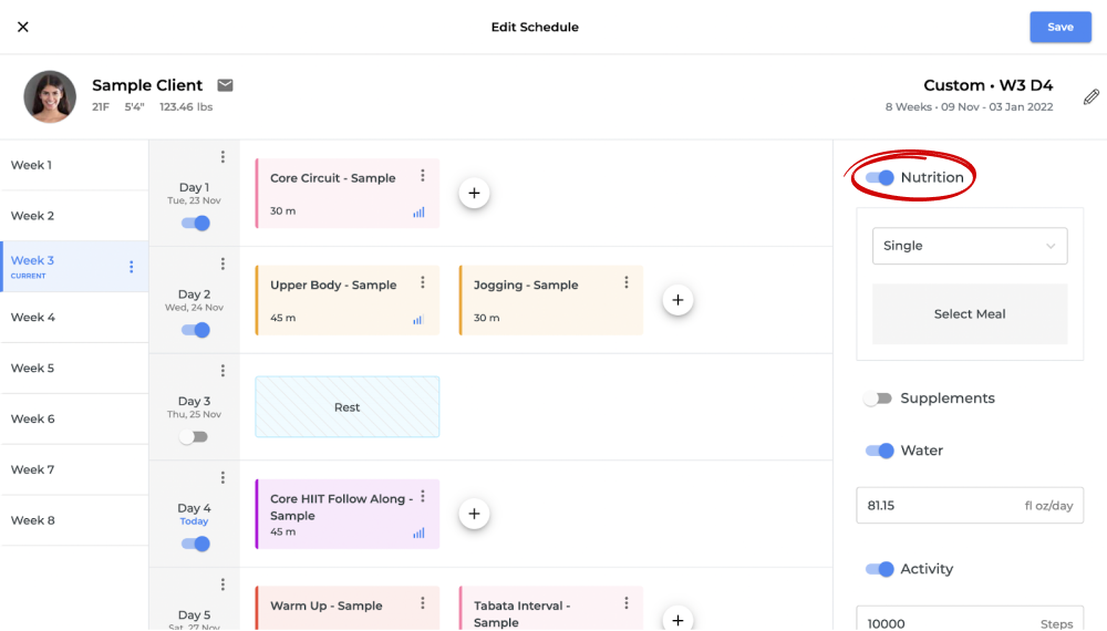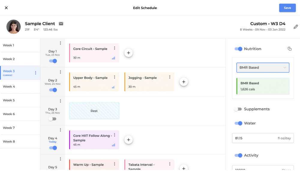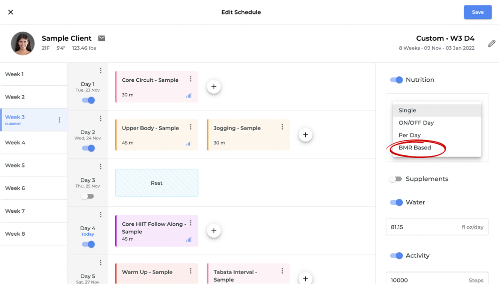 4. Once you select the ‘BMR Based’ option, a macro-based meal plan will be assigned to your client based on their basic details such as age, weight, height and the answer they have provided in the onboarding questionnaire. Click on ‘Save’ on the top right corner of the screen to assign this schedule to your client.
